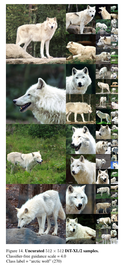 | 512×512分辨率的DiT-XL/2模型未筛选样本,无分类器引导尺度 = 4.0,类别标签 = “北极狼”(270) |