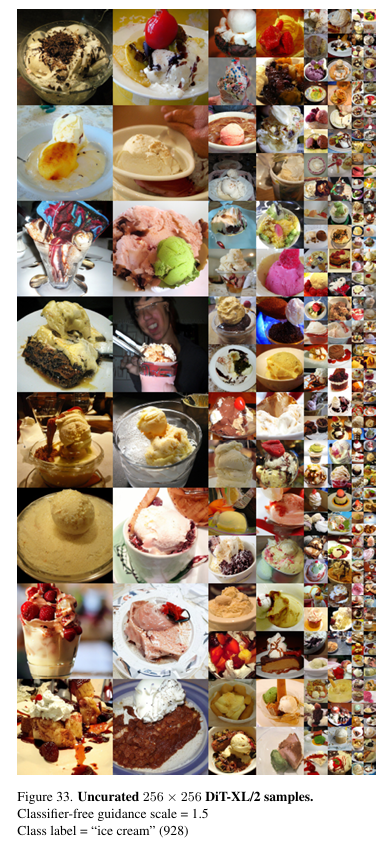 256×256分辨率的DiT-XL/2模型未筛选样本,无分类器引导尺度 = 1.5,类别标签 = “冰淇淋”(928) |