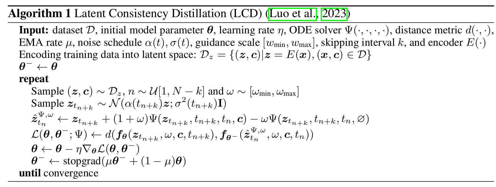 潜在一致性模型(LCM)(Luo 等人,2023)采用单阶段引导蒸馏方法进行训练,它利用预训练自编码器的潜在空间将引导扩散模型蒸馏为 LCM。这一过程涉及求解增强型概率流 ODE(PF-ODE),这是一种数学公式,可确保生成的样本遵循能产生高质量图像的轨迹。蒸馏过程的重点是在显著减少所需采样步骤数量的同时,保持这些轨迹的保真度。该方法包含诸如跳步技术等创新手段以加快收敛速度。潜在一致性蒸馏(LCD)的伪代码如算法 1 所示。