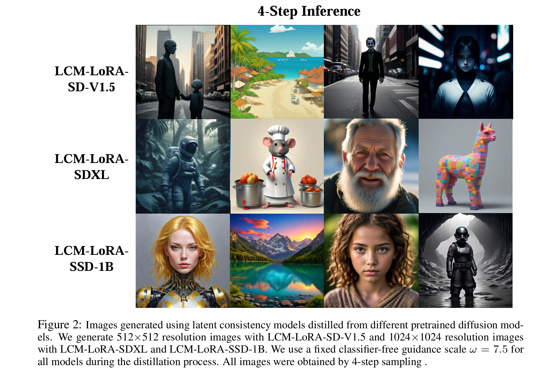 | 图 2:使用从不同预训练扩散模型蒸馏得到的潜在一致性模型生成的图像。我们使用 LCM-LoRA-SD-V1.5 生成 512×512 分辨率的图像,使用 LCM-LoRA-SDXL 和 LCM-LoRA-SSD-1B 生成 1024×1024 分辨率的图像。在蒸馏过程中,我们为所有模型使用固定的无分类器引导尺度 $\omega = 7.5$。所有图像均通过 4 步采样获得。 |