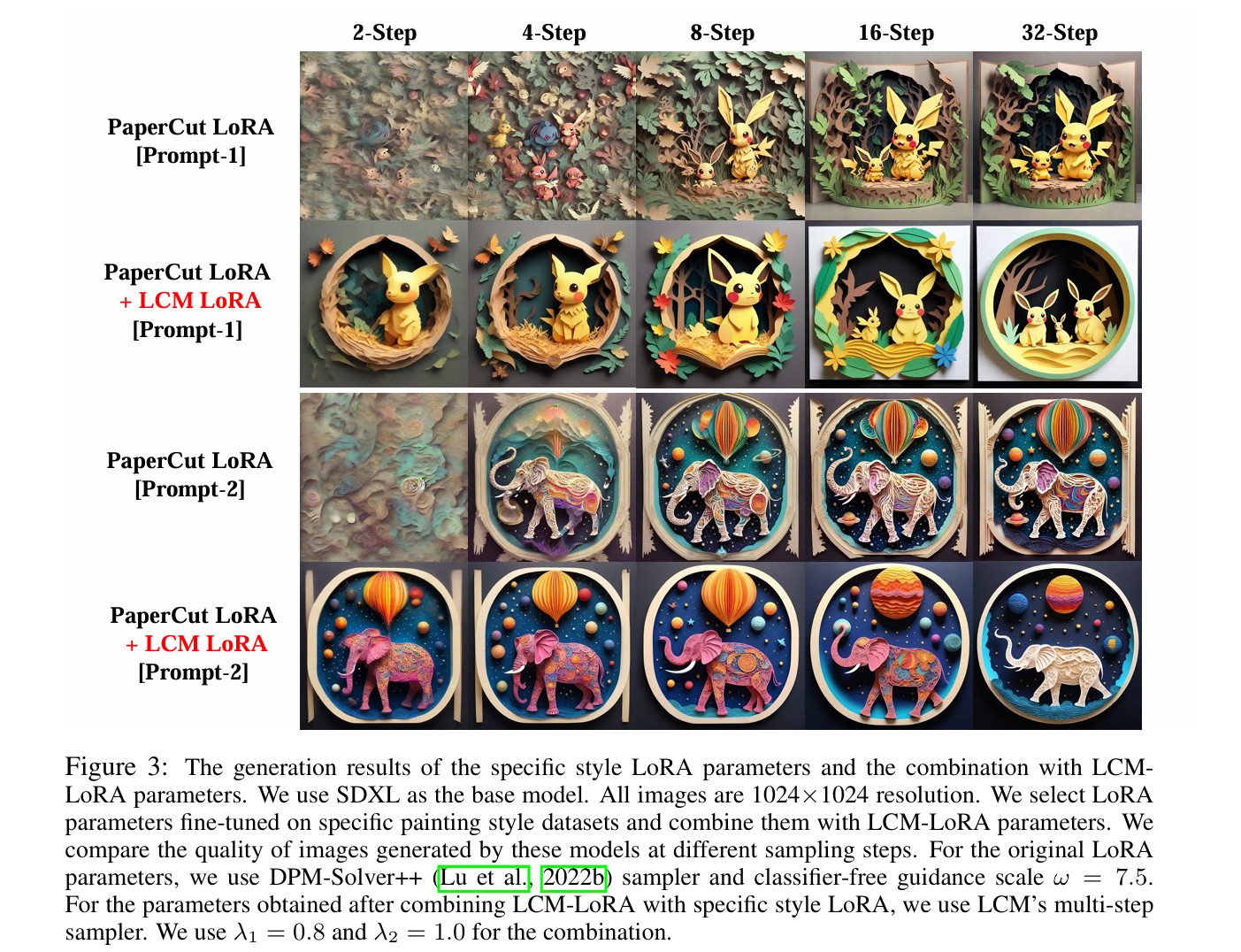 是加速向量 $\tau_{LCM}$ 和风格向量 $\tau’$ 的线性组合。这里的 $\lambda_1$ 和 $\lambda_2$ 是超参数。特定风格 LoRA 参数及其与 LCM-LoRA 参数组合的生成结果如图 3 所示。需要注意的是,我们没有对组合后的参数进行进一步训练。