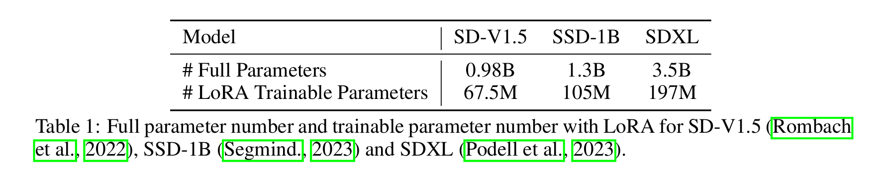 | 表 1:SD-V1.5(Rombach 等人,2022)、SSD-1B(Segmind.,2023)和 SDXL(Podell 等人,2023)的完整参数数量和使用 LoRA 时的可训练参数数量。 |